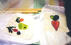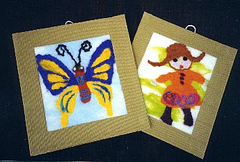 色のついた羊の原毛をつかって、自分で描いた絵の額をつくりましょう。